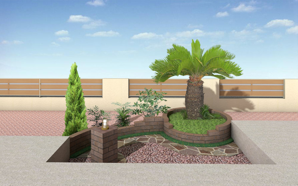 管理の容易なソテツを中心に、レンガ積みと石張りを配置したプランです。夜間も屋内から見える所なので、マリンランプで夜の雰囲気も良くしました。