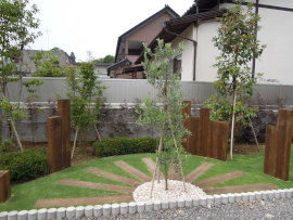 植木を境界沿いに植える事で敷地外からの視線を和らげて、庭も広く使う事ができます。植物だけだと単調になるので、レンガの花壇もご提案しました。